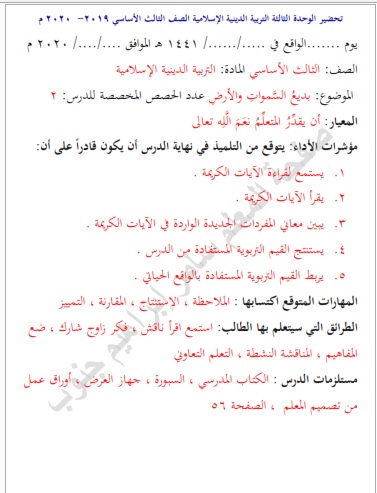 تحضير الوحدة الثالثة في التربية الدينية الإسلامية للصف الثالث الفصل الثاني 2019 2020