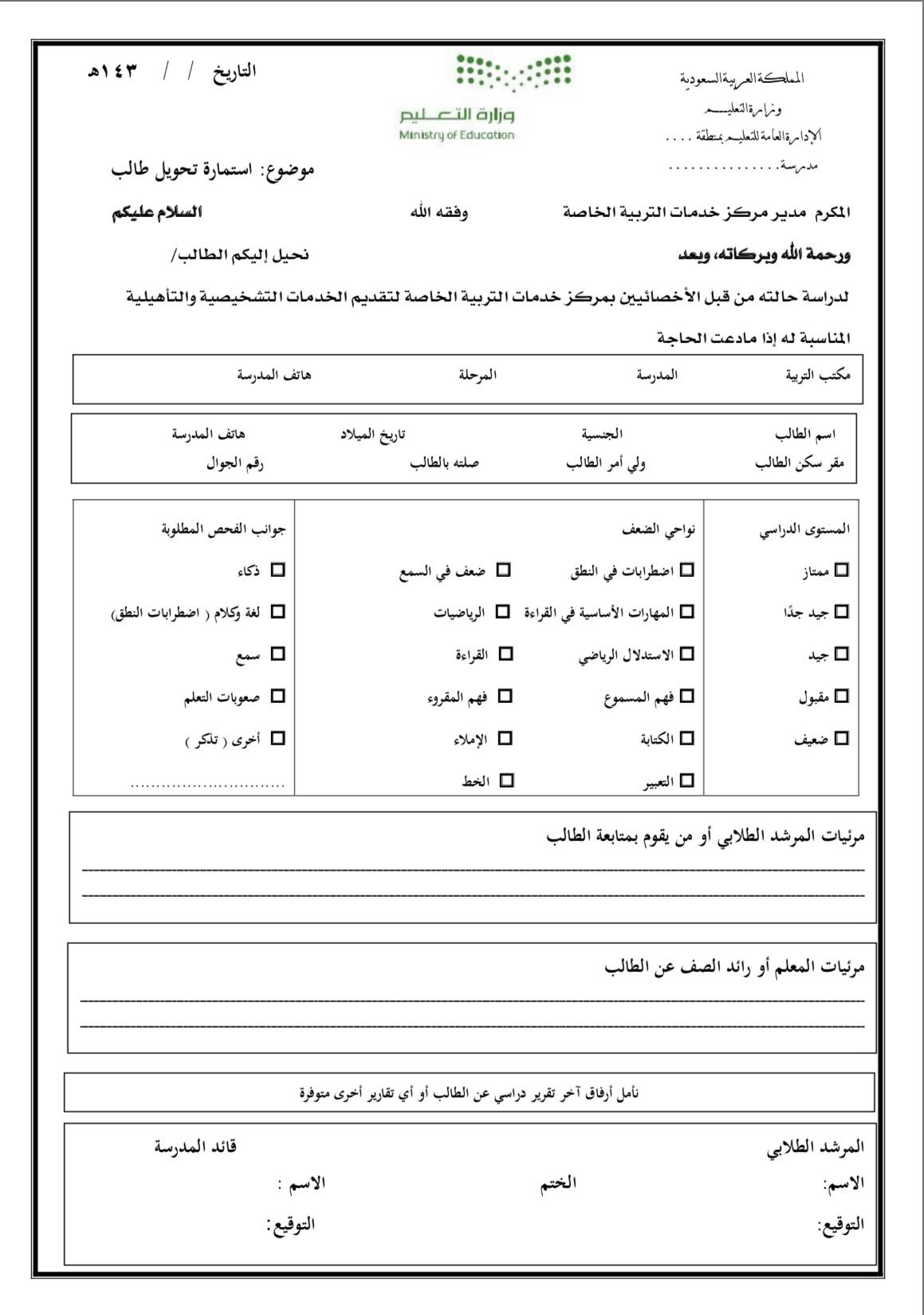 استمارة نقل طالبة من مدرسة الى اخرى